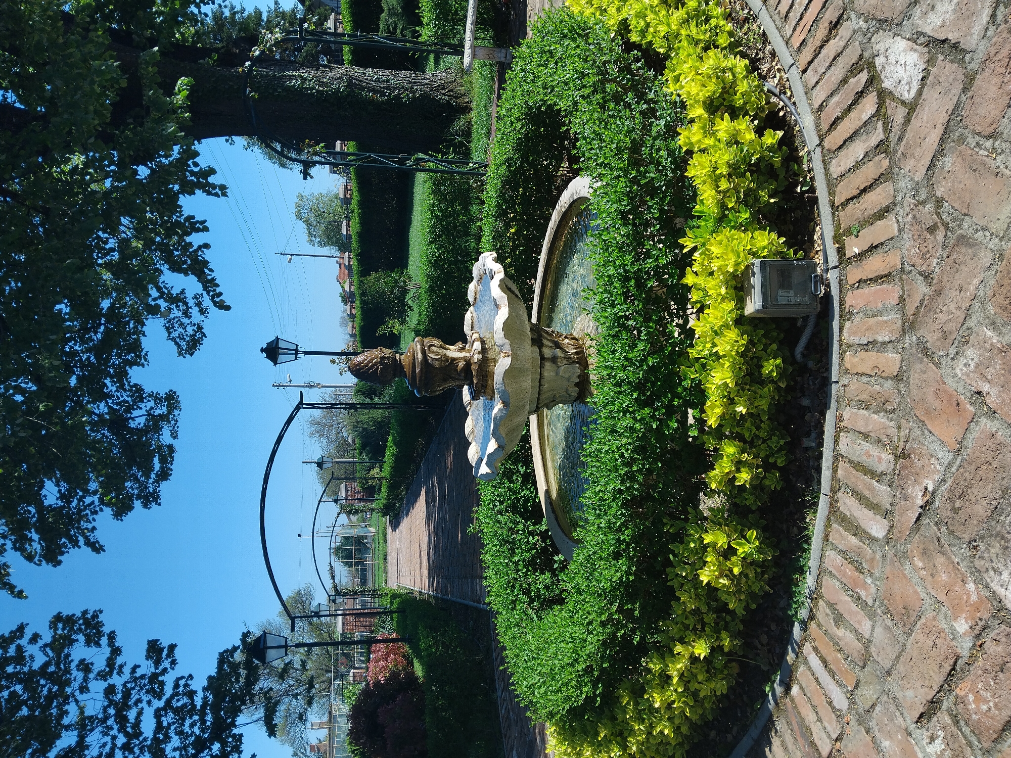 The image depicts a fountain in a garden in Asenovets, Bulgaria. The fountain is surrounded by green shrubbery, with a brick walkway adjacent to the fountain. The image also captures a portion of the park, including lamp posts and other shrubbery along the pathway. The sky is clear.