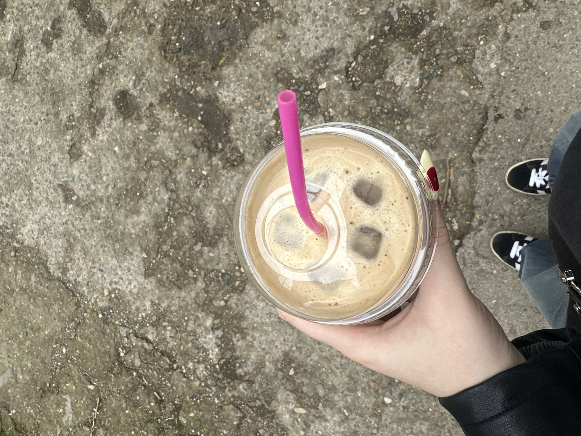 A person holds a plastic cup of iced coffee with a pink straw over concrete in Stara Zagora, Bulgaria. The person wears a black leather jacket and blue jeans. One shoe is visible, a black canvas shoe with white laces. The background is mottled gray concrete. The drink contains ice cubes. The person’s hand is visible, and their nails are painted with a red design.