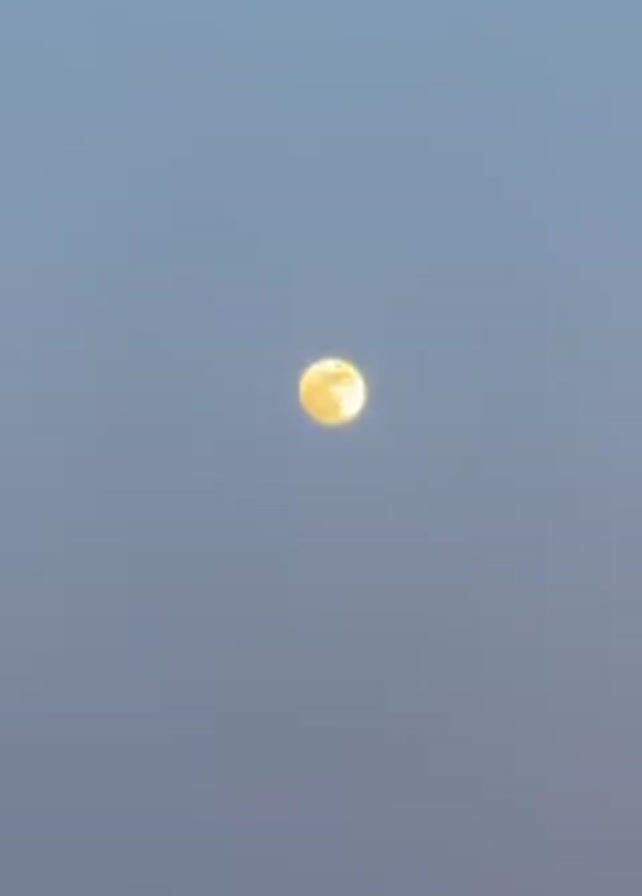 full moon in a clear sky. The moon is yellow, round, and small in the frame. There are some dark trees barely visible at the very bottom of the shot. The sky is a light blue. The camera remains still throughout.