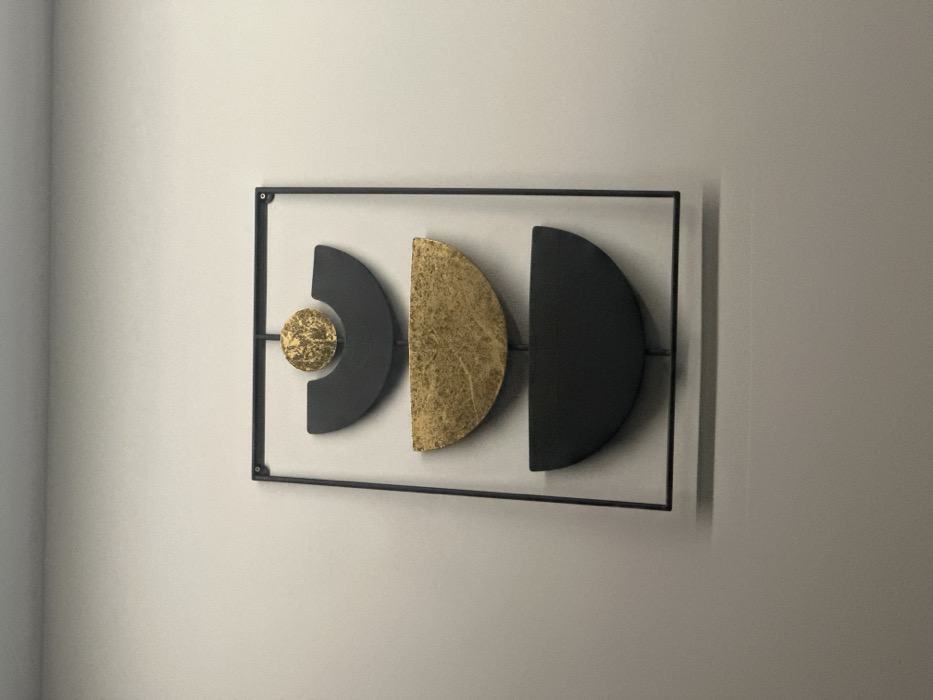 A rectangular wall decoration is mounted centrally on a plain, light grey wall in Sofia, Bulgaria. The decoration consists of a black metallic frame enclosing three vertically stacked abstract elements. The top element features a textured, circular gold-colored disk positioned directly above a matte black semi-circular shape, open upwards. The middle element is a larger, textured gold-colored semi-circular shape, also open upwards. The bottom element is a matte black semi-circular shape, larger than the top black element and open upwards. The entire piece casts faint shadows directly below and to its right. No people, actions, or interactions are present in the scene.