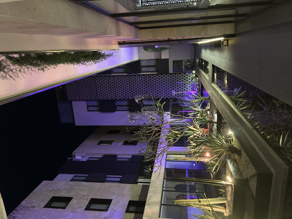 An upward, nighttime view captures a tall building illuminated with a purple hue. The structure showcases varying architectural designs across its floors. In the foreground, a modern, concrete structure features a garden bed filled with lush greenery and tall cacti. The frame is completed by the dark sky above and ambient lighting accentuating the building's details.