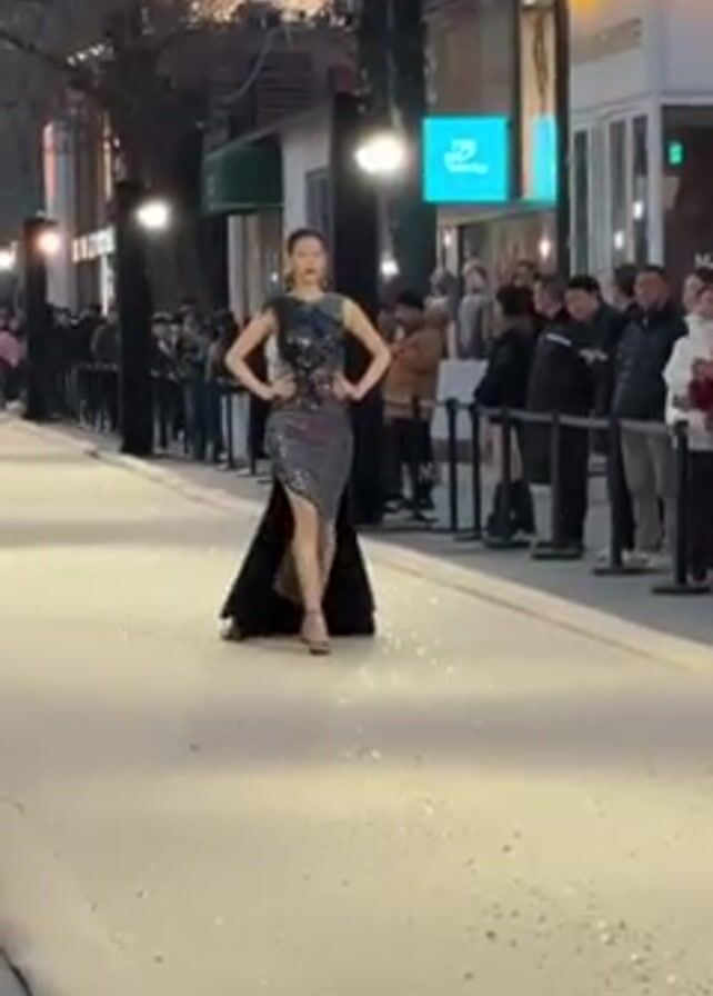 A fashion model stands on an outdoor runway, striking a pose with her hands on her hips. She is wearing a dark dress that features a shimmering top, a sequined skirt with a high slit, and a long train. She is also wearing high-heeled sandals. The runway is lined with spectators on either side, and there are buildings in the background. The ground is covered in a light scattering of confetti or glitter.
