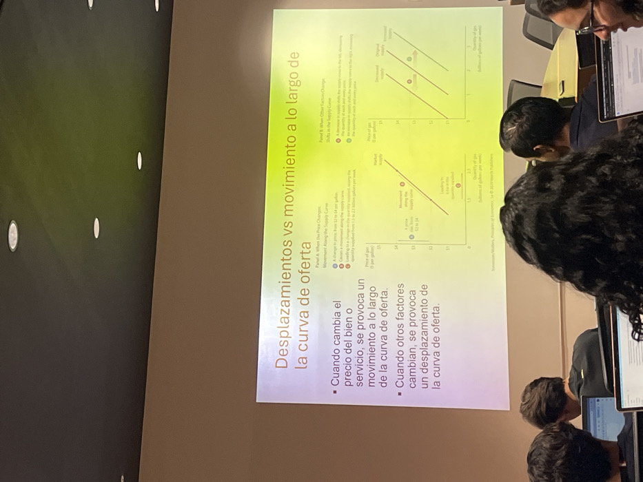 slide in Spanish, titled "Displacements vs. Movement Along the Supply Curve". The slide explains that a change in the price of a good or service causes a movement along the supply curve, while a change in other factors causes a shift in the supply curve. Two graphs illustrate this concept. The first graph shows movement along the supply curve as the price of gas increases. The second graph shows a shift in the supply curve due to other factors.