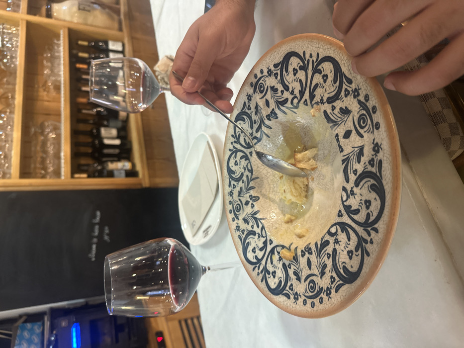 This image captures an indoor dining scene at a restaurant or tavern in Córdoba, Spain. In the foreground, a patterned ceramic bowl, decorated with blue and white motifs, contains remnants of a dish, specifically pieces of bread soaking in a clear, oily liquid. A person's right hand, with a dark-skinned complexion, holds a silver spoon, actively scooping or stirring the contents within the bowl. A second hand is partially visible at the bottom right. On the white tabletop, two stemmed wine glasses are present; the glass on the left contains red wine, while the one on the right is mostly empty. Behind the bowl, a small white oval plate holds a folded brown napkin or menu. The background features a wooden shelving unit filled with numerous wine bottles and an assortment of clear glassware, including various wine glasses and tumblers. To the far right of the shelving, a large, light-colored earthenware jar is visible. On the left side of the background, a dark chalkboard displays white chalk writing, partially obscured, and next to it, a commercial beverage dispenser emits a blue light. The overall environment suggests a casual yet traditional dining establishment.