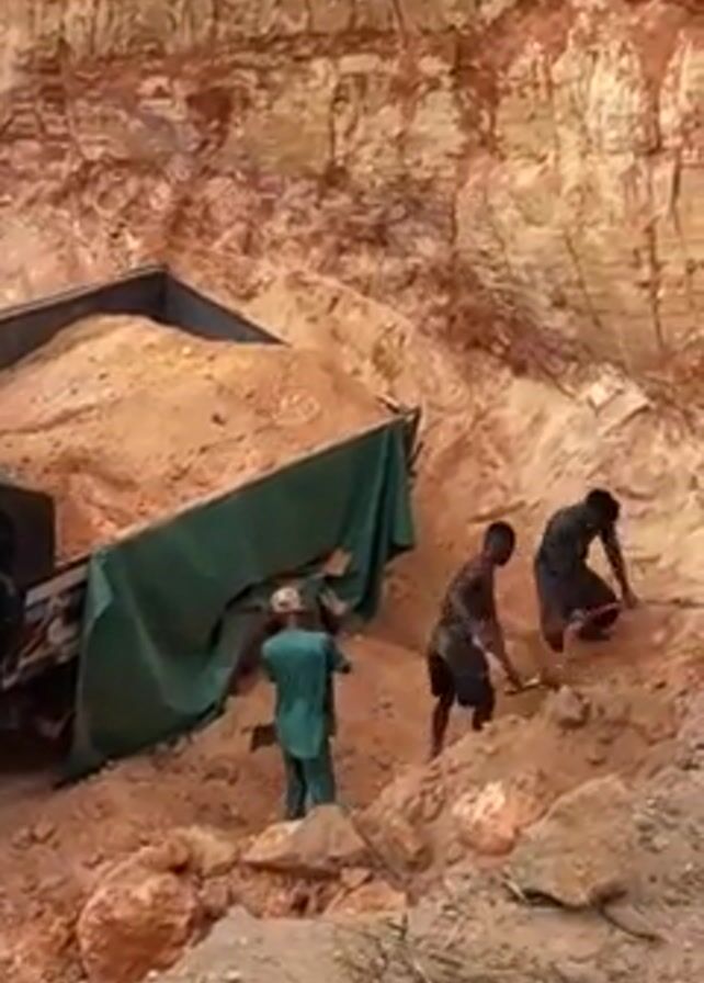 Three men are shown digging into a pile of tan gravelly material at the base of a quarry, loading it into the raised bed of a large green truck with a green tarp covering part of the bed. Two men are bare-chested and using shovels, while the third man is wearing a light green tunic and also appears to be shoveling. The walls of the quarry are made up of different layers of red, white, and tan stone and gravel. In a wider shot, the truck is seen inside the quarry with the men digging, surrounded by the steep walls of the quarry. Green trees are visible on the top edge of the quarry along with a person walking on the top edge.