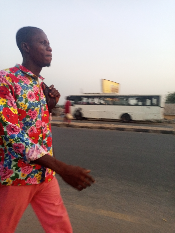 A man walks along a road next to a blurry white bus. He wears a floral long-sleeve shirt and light red pants. The road is asphalt. A yellow structure is visible behind the bus. The sky is pale and overcast. The overall impression is one of motion blur, likely due to a moving camera.