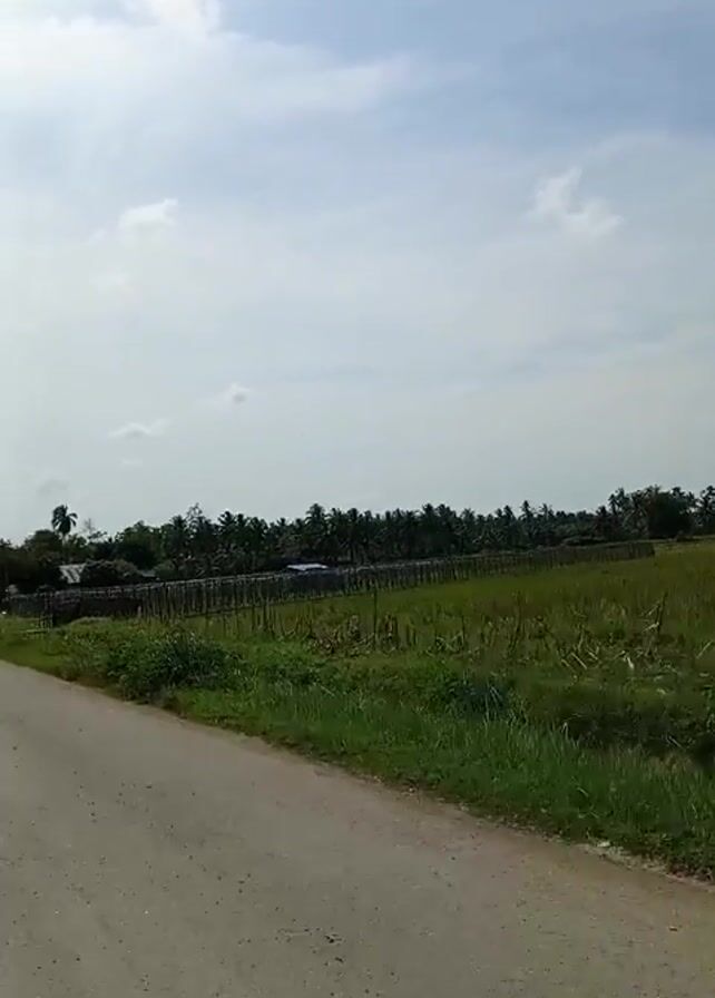 single-lane, unpaved road beside a green field. The field has a simple wooden fence along its perimeter, beyond which is a line of trees. The sky is blue with scattered white clouds. A vehicle appears to be moving along the road, creating a slight vibration in the video. There are no people visible in the shot.