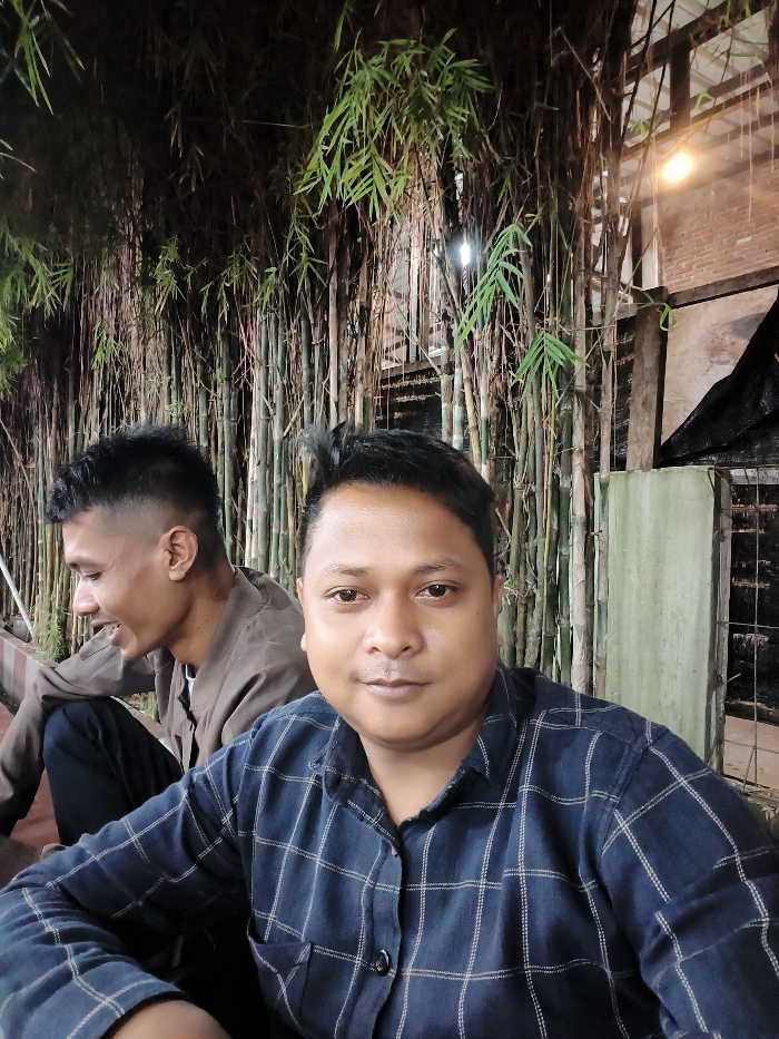 Two men are seated outdoors at night. Tall bamboo stalks form a backdrop, along with a brick building in the background. The man closest to the camera wears a blue plaid shirt with a buttoned collar. He is looking directly ahead. The man behind him, who is turned to the side, wears a brown jacket.