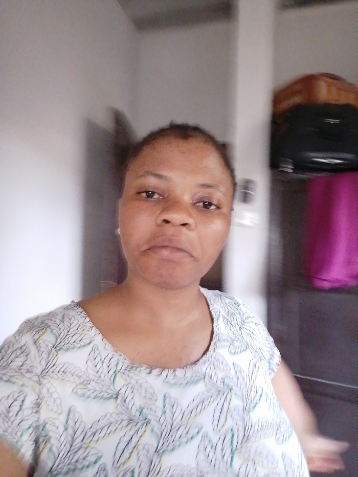 A blurry, medium shot of a woman indoors. She has dark hair and is wearing a white shirt with a leafy pattern. Behind her is a light-colored wall on the left and a darker structure with luggage on top and a purple cloth hanging down on the right. The photograph appears to be slightly out of focus, contributing to the indistinct background.