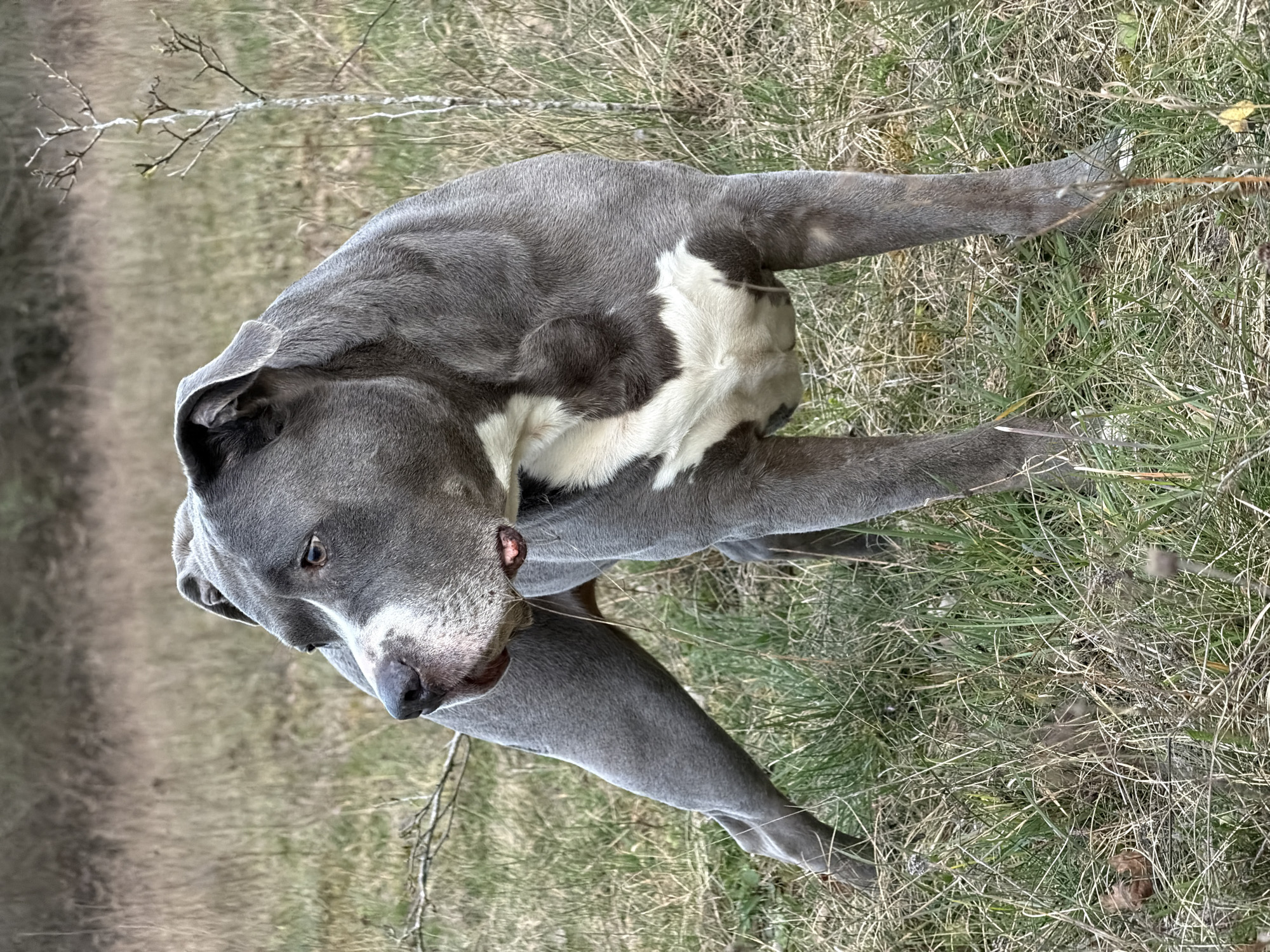 - "A large, muscular dog with short, blue-grey fur and white markings on its chest and muzzle stands in a grassy field in Schifflange, Luxembourg" by FM-n22Rc2, licensed under CC BY 4.0