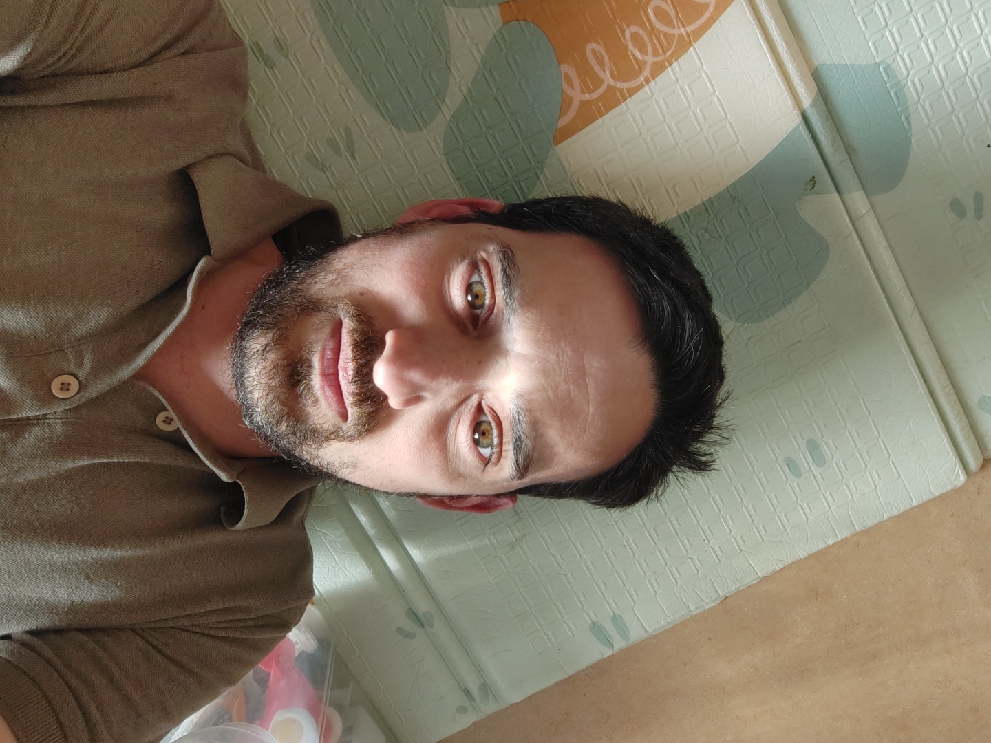 A close-up, upward-angled portrait shot depicts an adult male centered in the frame. He has dark hair, a beard, and a mustache, with his brown/hazel eyes exhibiting strong specular reflections. He is wearing a light olive-green collared polo shirt with two buttons visible. The background comprises a light green padded playmat with a textured grid pattern and abstract light blue and orange shapes, occupying the left and upper sections of the image. To the right, a plain beige surface is present. A translucent container holding colorful objects is partially visible in the bottom right corner. The environment appears to be an indoor, domestic setting. The precise location within Ramat Gan, Israel, cannot be determined from the visual data provided.