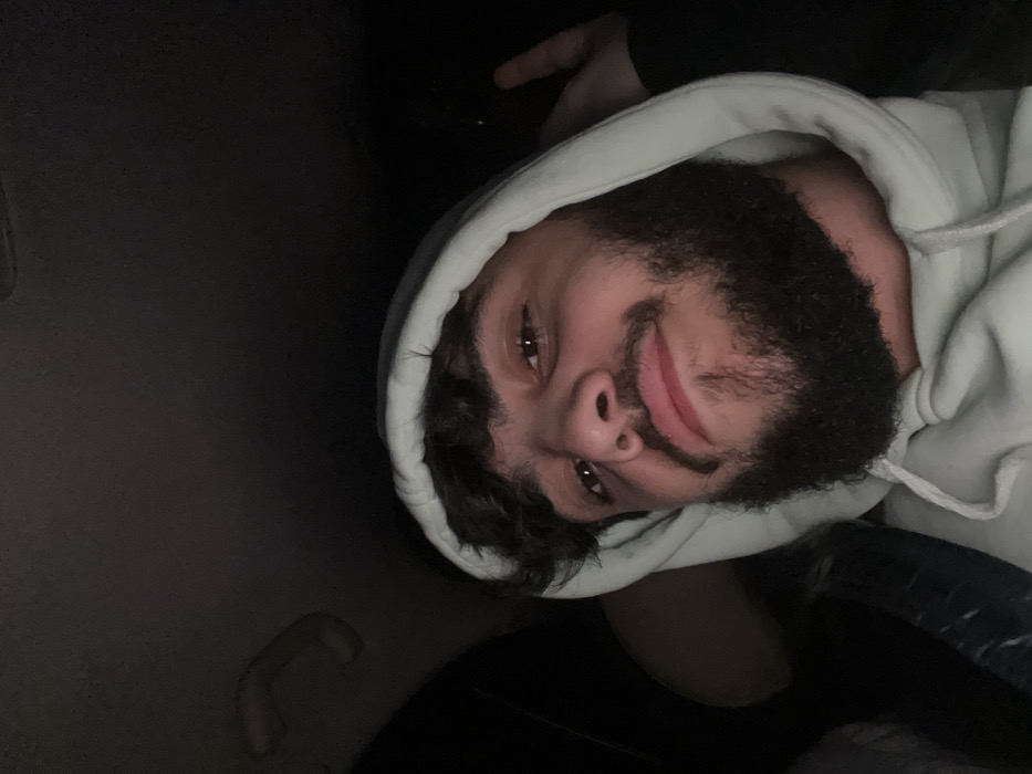 A person with dark hair and a full beard wears a light-colored hooded sweatshirt. They are looking at the camera with a slight smile. The photo is taken from a low angle, and the background is dark and blurry. The lighting is dim, casting shadows on the person's face and hood. A hand is visible in the upper center of the frame, slightly out of focus. The person's face and upper body are the main focal points.