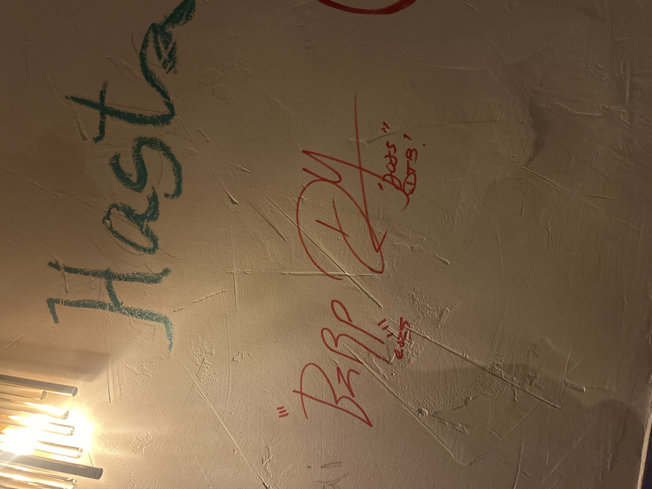 textured, light-colored wall with graffiti. In blue-green, the word "Hasta" is written vertically. In red, there's a signature, "Dy," and the phrase ""Bats" BTS's" is inscribed nearby. Below, the inscription ""BapB" BTS" is visible. The writing appears to be done in marker, and there's a light fixture visible in the lower left corner of the image.