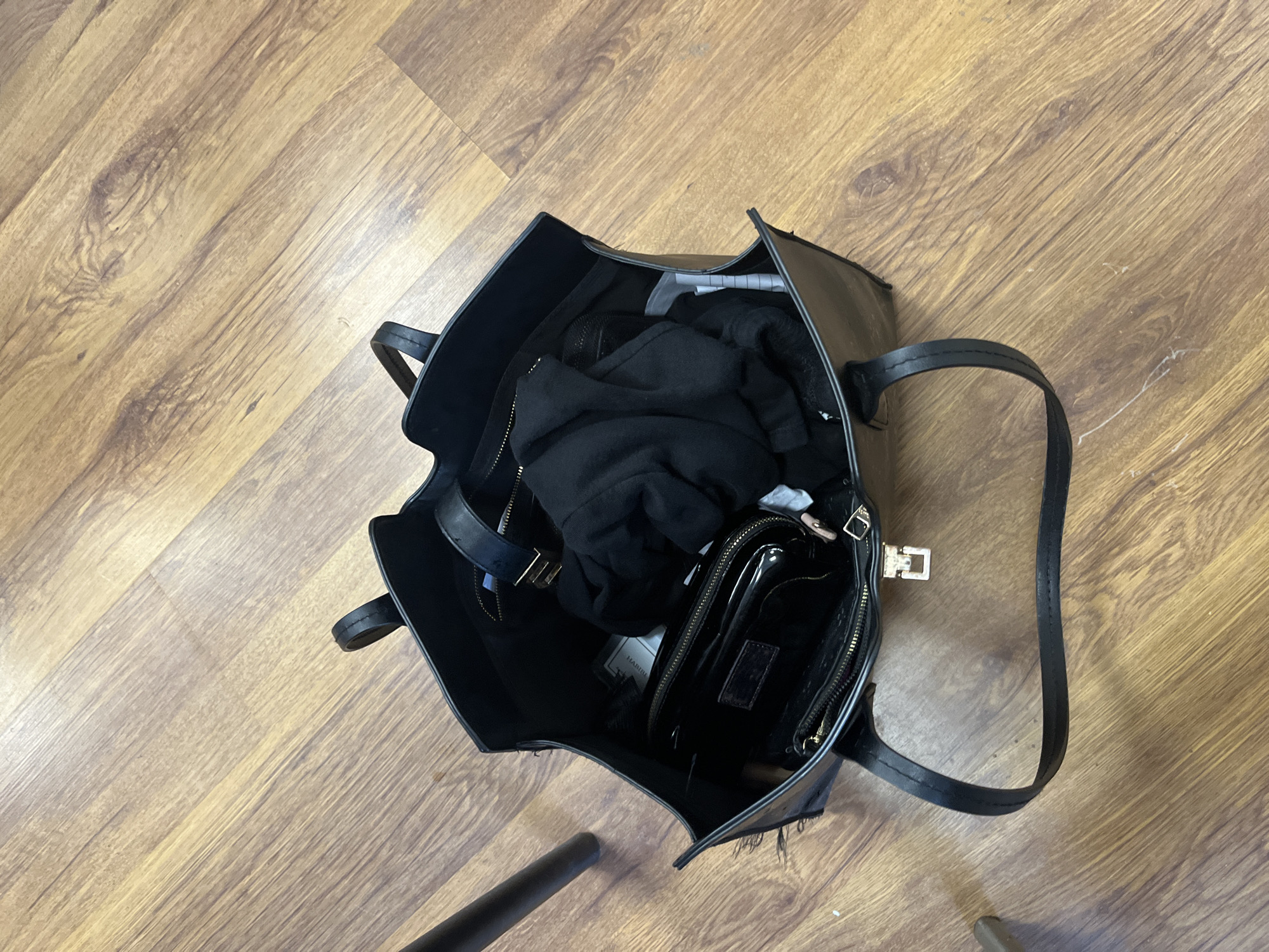 The scene is an overhead shot of a black tote bag lying on a light-brown wood-grained surface