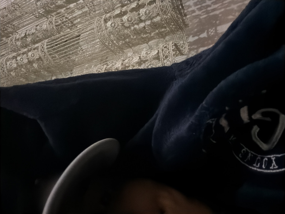In a dimly lit indoor setting in Dar Bouazza, Morocco, a close-up, tilted image depicts a person partially obscured by shadows. The individual's lower face, specifically the chin and mouth area, is visible on the left, beneath the brim of a light-colored hat. The person is wearing a dark, possibly navy blue or black, plush hooded garment, which features a light-colored emblem on its front, displaying the text "YOUTH" and a stylized "G" or heart shape. To the right of the person, a light-colored, intricately patterned fabric, possibly a curtain or tapestry, is visible. This fabric exhibits multiple horizontal bands of dense lacework or embroidery with floral and geometric designs, including short fringed sections. No direct actions or interactions are discernible beyond the person's presence in the scene.