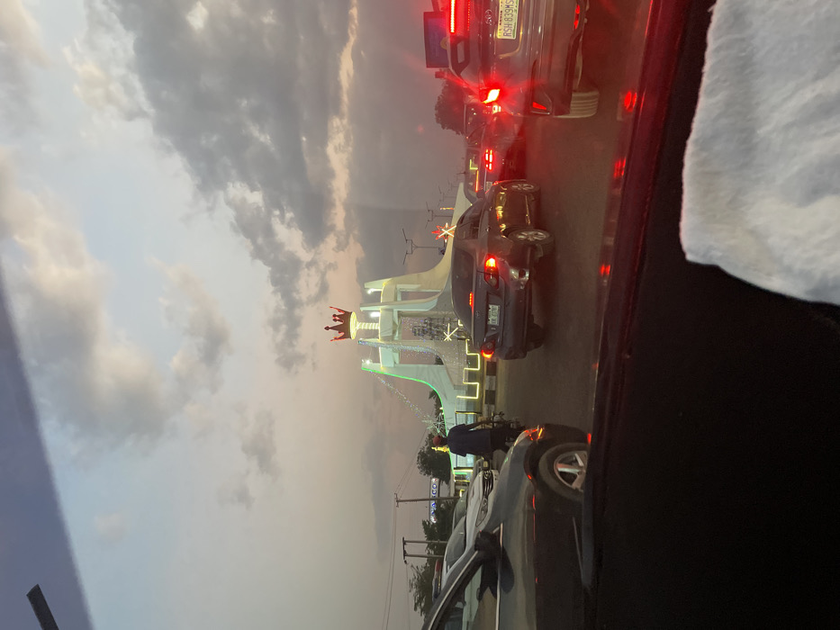 Vehicles occupy a roadway, foregrounded by partial views of a car's interior. In the distance, a decorative archway with a crown atop its structure is visible, adorned with lights. Power lines and a gas station sign add to the street scene's backdrop. The sky, filled with various cloud formations, transitions from a brighter hue near the horizon to a darker shade above.