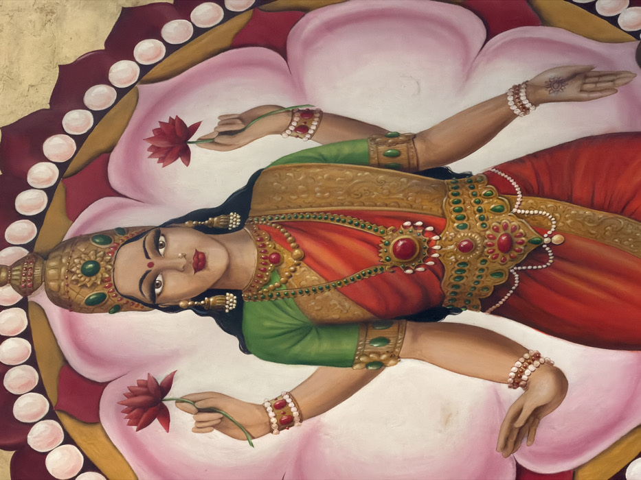 - "This image depicts a finely detailed painting of a four-armed female deity, likely Lakshmi, centrally positioned against a stylized backdrop of pink lotus petals, a red border, and an outer golden frame with white oval adornments" by FM-i85E53, licensed under CC BY 4.0