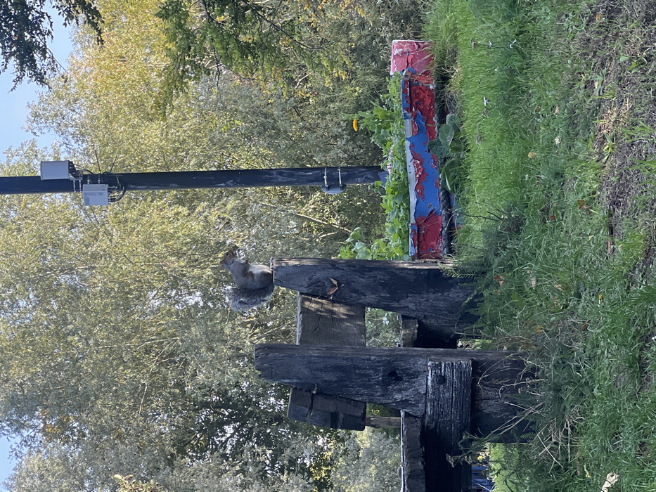 This image depicts an outdoor scene in Colchester, United Kingdom. A single grey squirrel (Sciurus carolinensis) is the central subject, positioned upright on a dark, weathered timber post that forms part of a heavy wooden bench located in the foreground-left. The squirrel faces right, holding a small object to its mouth with its front paws. To the right of the wooden structure, a black utility pole stands vertically, fitted with several light grey rectangular boxes and associated cable bundles. Further right and slightly forward of the pole, a planter box is visible. This planter, painted red and blue with significant peeling paint, appears to be a repurposed section of an old boat. It contains various green leafy plants and a single yellow flower. The ground in the foreground and midground is covered with green grass and herbaceous vegetation. The background features dense foliage from deciduous trees with light green leaves, suggesting a wooded or park-like environment. A darker evergreen tree is partially visible on the far right. The scene is illuminated by natural daylight. No human subjects are present.