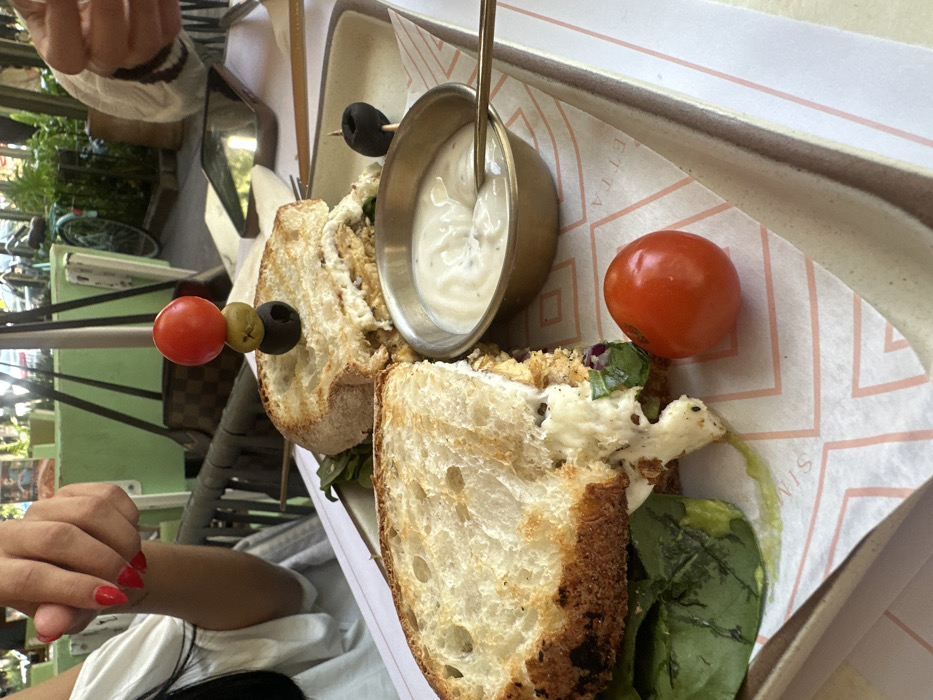 A sandwich, cut in half and held together with skewers, sits on a tray lined with patterned paper. One skewer holds a tomato and two olives. A small metal dish with a white sauce sits on the sandwich, along with a toothpick or small spoon. A single tomato rests near the sandwich. The sandwich appears to contain white filling and green leafy vegetables. Portions of people's hands are visible around the tray.