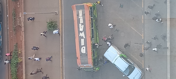 An aerial, high-angle view depicts an urban street scene in Nairobi, Kenya, under daylight conditions