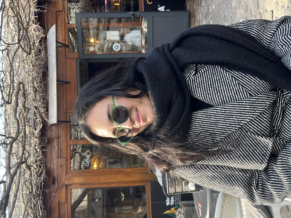 - "A female subject with long, dark hair, wearing green-framed round sunglasses, a black textured scarf, and a black-and-white striped coat, is depicted seated outdoors" by FM-RPBd82, licensed under CC BY 4.0