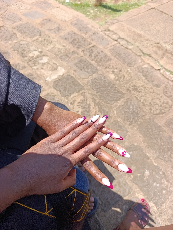 A close-up, top-down view depicts a person's hands and lower body situated on an outdoor, sunlit, stone-paved surface in Nairobi, Kenya. This surface comprises irregularly shaped, light-colored flagstones with visible grout lines, transitioning to a blurry area of green foliage and reddish soil in the upper background. The individual is seated, wearing dark blue trousers or jeans, partially obscured by a dark garment or accessory featuring yellow geometric patterns and black tassels. A bare foot with red-painted toenails, clad in a brown open-toed sandal, is visible in the lower right corner. Two dark-skinned hands rest one over the other in the foreground. The upper hand prominently displays long, almond-shaped artificial nails, each painted white with a deep red/maroon tip. Some nails also feature subtle, dark, abstract patterns near the cuticle. Direct sunlight illuminates the scene, casting defined shadows from the hands and body onto the paving.