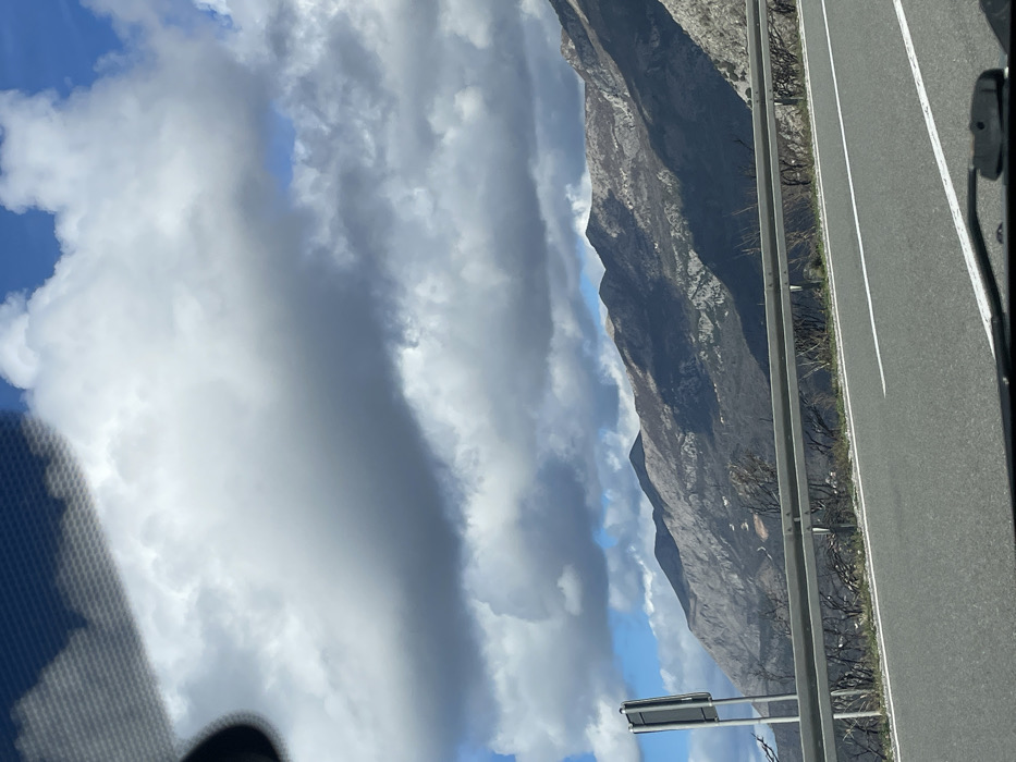 The image depicts a mountainous landscape and a section of a roadway in Mišići, Montenegro, observed from inside a vehicle. The foreground shows the top edge of a dashboard and a windshield wiper mechanism. Above this, a two-lane asphalt road curves slightly to the right, marked with a solid white edge line and a dashed white lane divider. A two-bar metallic guardrail runs parallel to the road on the right side. Beyond the guardrail, the terrain slopes downwards, featuring sparse, bare trees and shrubs, some appearing blackened. To the far left, a grey rectangular road sign on a pole is visible. The midground is dominated by a range of rugged mountains, displaying rocky outcrops and sparse vegetation. Portions of the mountains are illuminated by sunlight, revealing lighter grey and brown tones, while other sections are deep in shadow, appearing dark grey. The background consists of a partially cloudy sky, with large, dense cumulus clouds casting shadows and patches of clear blue sky visible.
