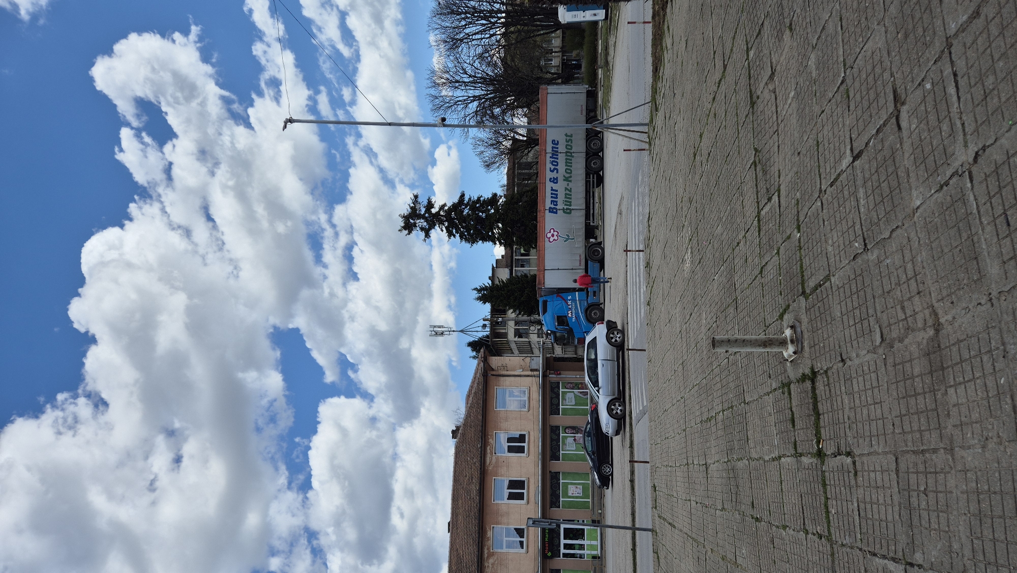 The image depicts a street scene in Mihaltsi, Bulgaria. A building with a brown roof and a light-colored facade stands beside a sidewalk paved with gray, square tiles. The building has multiple windows and green trim. Two cars, one black and one silver, are parked alongside the sidewalk. A blue and white semi-trailer truck is parked further down the street. The trailer has the words "Baur & Söhne Gunz-Kompost" written on it. A person wearing a red jacket is standing near the trailer. A utility pole stretches into the sky, which is filled with fluffy white clouds and patches of blue sky. Bare trees can be seen in the background.