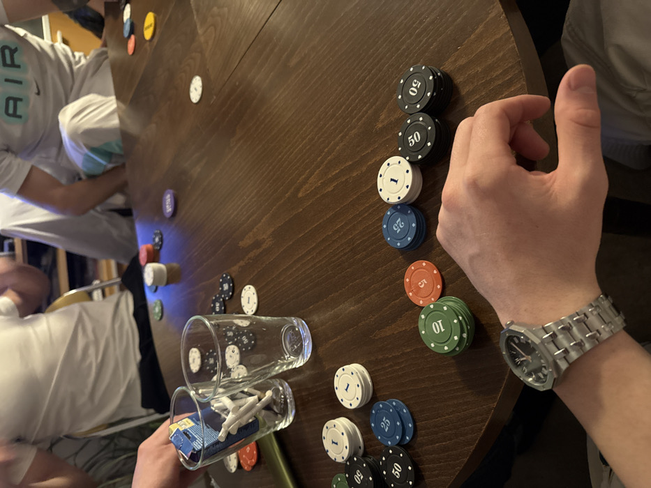 The image depicts an indoor scene in Varna, Bulgaria, centered on a dark brown rectangular table, likely made of wood or laminate, with a visible seam from an extension mechanism. The primary activity appears to be a poker game or a similar chip-based card game. In the immediate foreground, a person's right hand, wearing a metallic wristwatch with a link bracelet and a dark-faced dial, rests on the table. Near this hand are organized stacks of poker chips: a stack of green chips marked "10", a single orange chip marked "5", a stack of blue chips marked "25", a stack of white chips marked "1", and two stacks of black chips marked "50". To the left, another person's forearm and hand are visible adjacent to two clear, empty drinking glasses. One glass contains several white cigarette butts and a blue and white cigarette pack, possibly branded "Kent". Further across the table, numerous other poker chips of various colors (white, blue, black, orange, green, purple) and denominations (1, 5, 10, 25, 50) are scattered and stacked, indicating active gameplay. In the background, two individuals are partially visible. One is wearing a plain white short-sleeved t-shirt. The other wears a white short-sleeved t-shirt featuring a light green "AIR" logo on the chest. Both appear to be seated. Blurred background elements include a yellow chair and light-colored walls or furniture, suggesting a casual, private setting. The lighting is artificial.