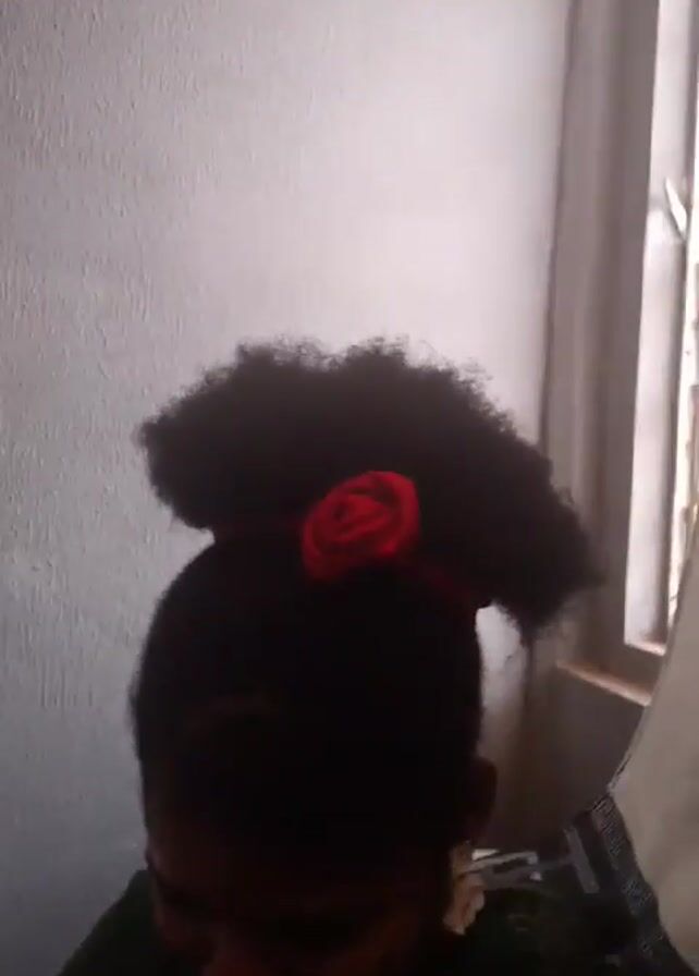A young woman with dark skin and black hair in a high bun is facing away from the camera. Her hair is decorated with a red rose and a small clip. She is wearing a red dress and has a green scarf draped over her shoulders. She is wearing white earrings. The background is a plain, light gray wall. She is sitting at a table. It is difficult to make out what she is doing. There is some ambient noise that includes talking.