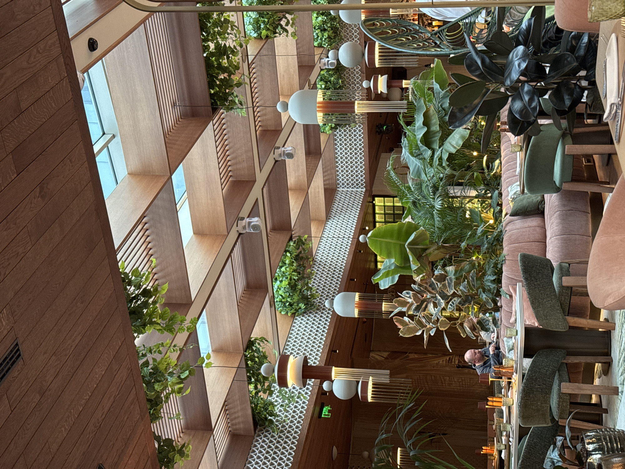 n indoor restaurant setting. The restaurant features a unique architectural design with wooden structures and integrated plant installations along the walls and ceiling. Decorative light fixtures hang from the ceiling. The seating area consists of chairs and a plush sofa, with tables set for dining. A man in a dark jacket is seated at one of the tables. Given the image's origin and context, it is likely that the restaurant is located in Plovdiv, Bulgaria.