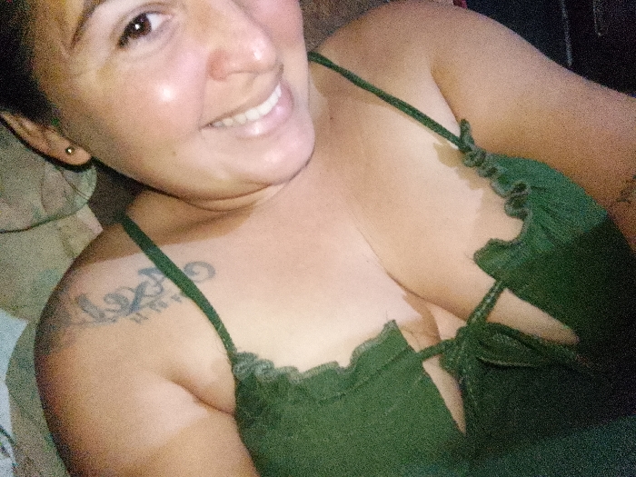 A light-skinned woman with brown eyes and dark hair smiles toward the camera. She wears a dark green top with spaghetti straps. The top has ruffled edges around the bust line. A tattoo is visible on her left shoulder. She has a gold earring in her left ear. The photo appears to be taken indoors, and a pillow can be seen behind her. The background is dark and blurred.