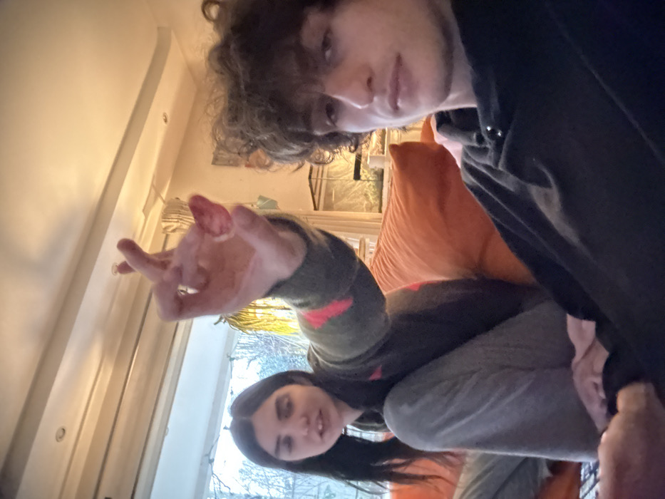 A selfie captures two people. A young man with curly brown hair and a dark hoodie angles the camera downward, showing his face and upper torso. Below him, a woman with long, dark hair glances upward, partially obscured by the man's arm reaching toward the camera. The background suggests an interior setting, possibly a living room, with a window and orange pillows visible. The overall composition is tilted, creating a slightly disorienting perspective.