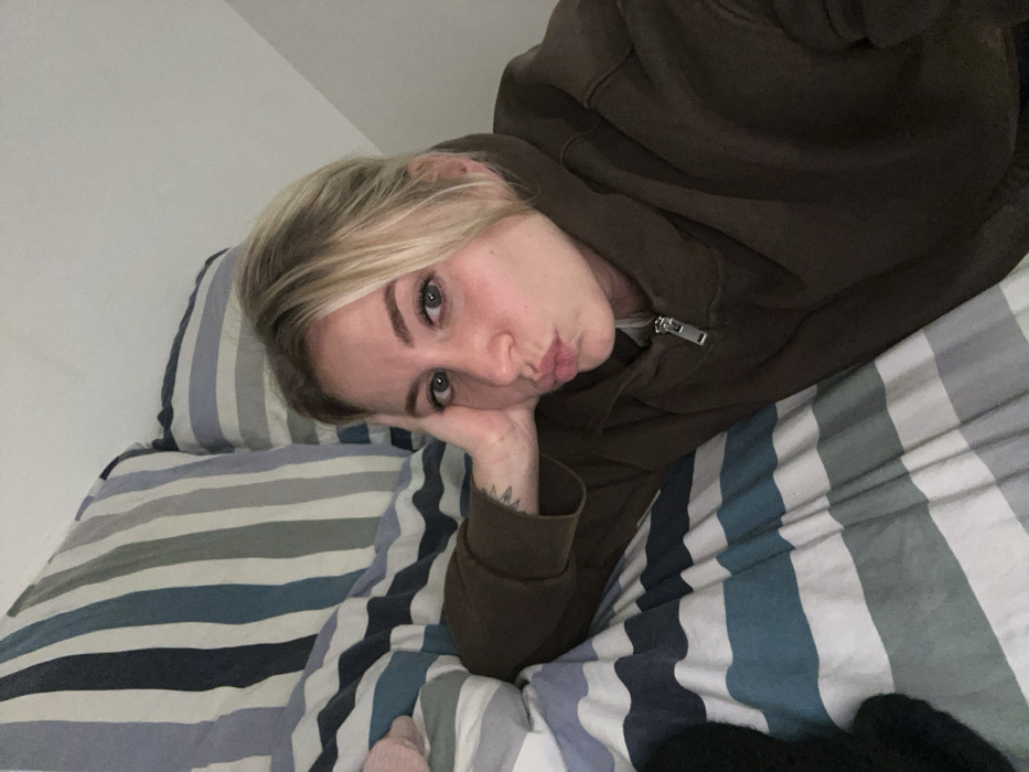 - "A blonde woman in a brown hoodie is lying on a striped bed" by FM-bcuvC3, licensed under CC BY 4.0