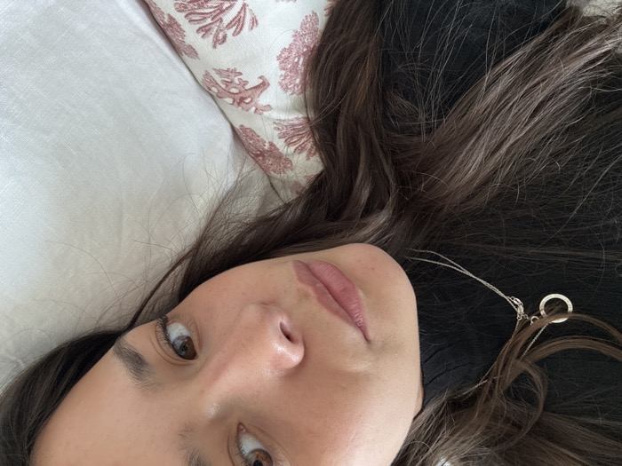 This image, taken in Naucalpan de Juárez, Mexico, presents a close-up, angled view of an adult female. She is positioned lying down, with her head slightly tilted. Her medium-long, dark brown hair, appearing parted on the left, cascades around her. Her brown eyes are directed upwards and slightly to the right. Her skin shows a natural complexion with subtle freckles on her nose and cheeks, and her lips are closed, colored with a light pink or nude lipstick. She is wearing a black, high-neck garment, likely a turtleneck. Around her neck is a silver-toned chain necklace with a circular pendant. Her head rests upon a decorative pillow, which displays a white background patterned with coral-red botanical motifs. Adjacent to this is a plain white pillow or sheet.
