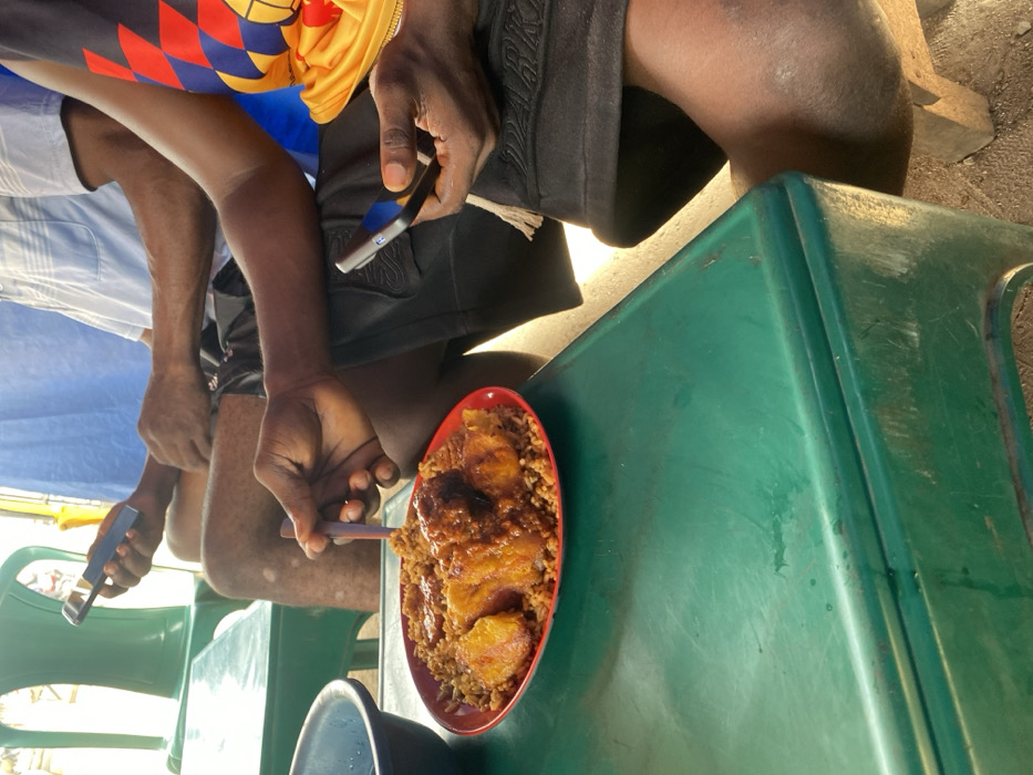 In Naze, Nigeria, two individuals are seated at a dark green, worn table in a casual outdoor setting. In the foreground, a person with dark skin wears black shorts and a partially visible colorful shirt. This person holds a dark smartphone in their left hand and a dark utensil in their right hand, poised over a red plate containing jollof rice, fried plantains, and a sauced item, possibly meat. A dark blue bowl is partially visible to the left on the table. In the background, a second individual, also with dark skin, wears a light blue collared shirt and black shorts, and is seated in a green plastic chair. This person holds a dark smartphone in their right hand. The ground is visible beneath the table, and a blue fabric element is present in the far background.