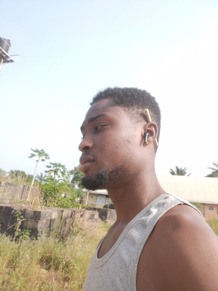 A young adult male, of dark skin tone, with short dark curly hair and a short beard, is depicted in profile, facing left, outdoors in Ishieke, Nigeria