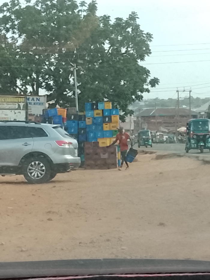 The image captures an outdoor urban scene in Jos, Nigeria, under a hazy sky. The immediate foreground features a coarse, light-brown dirt surface. At the bottom, a dark horizontal surface, possibly a vehicle dashboard, is visible. To the left, the rear section of a silver SUV is parked on the dirt shoulder, facing right. Behind the SUV and partially obscured by a large green-leafed tree, a white sign with black text reads "NIC LABORATORY" and "MAN THE MOVEMENT". Centrally located is a tall, irregular stack of empty plastic crates, primarily blue, yellow, and dark brown/black. A male individual, appearing dark-skinned and wearing a red short-sleeved shirt and dark blue lower garments, walks from left to right in front of these crates. He carries a dark blue plastic crate in his right hand, with his left arm extended towards the main stack. He appears to be barefoot or wearing light footwear. Beyond the dirt area, a paved road is visible. A green Keke Napep (auto-rickshaw) with the number "0J 270" on its front is prominent on the far right, facing left. Another green Keke Napep and other indistinct vehicles are further down the road, moving away from the viewer. The background shows low-rise buildings with light-colored walls and dark roofs, interspersed with numerous green trees and utility poles carrying overhead wires. The overall setting suggests a commercial or semi-commercial street environment.