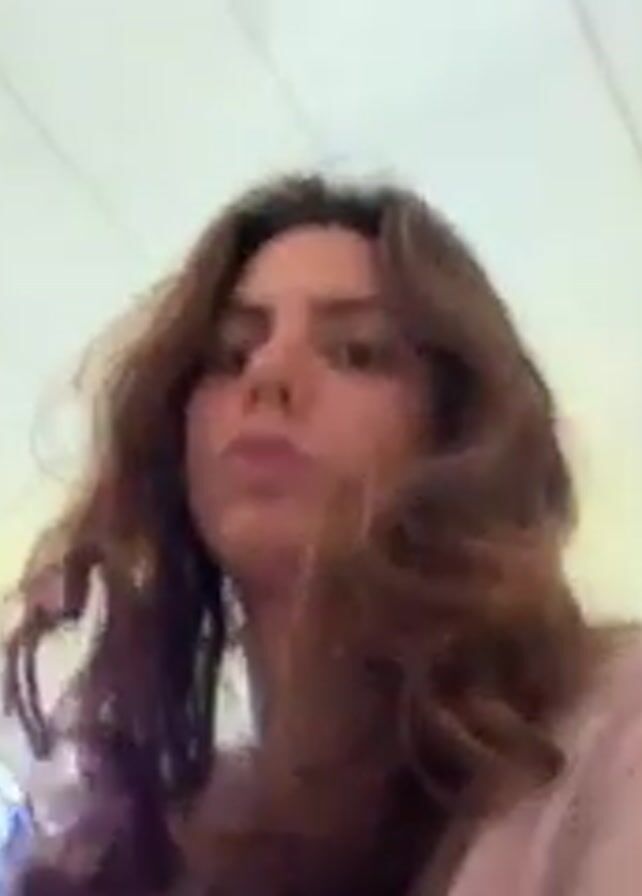 young woman with wavy brown hair in an airport. She films herself as a man writes on her arm with a pink marker. The background shows other people, luggage, and airport signage.