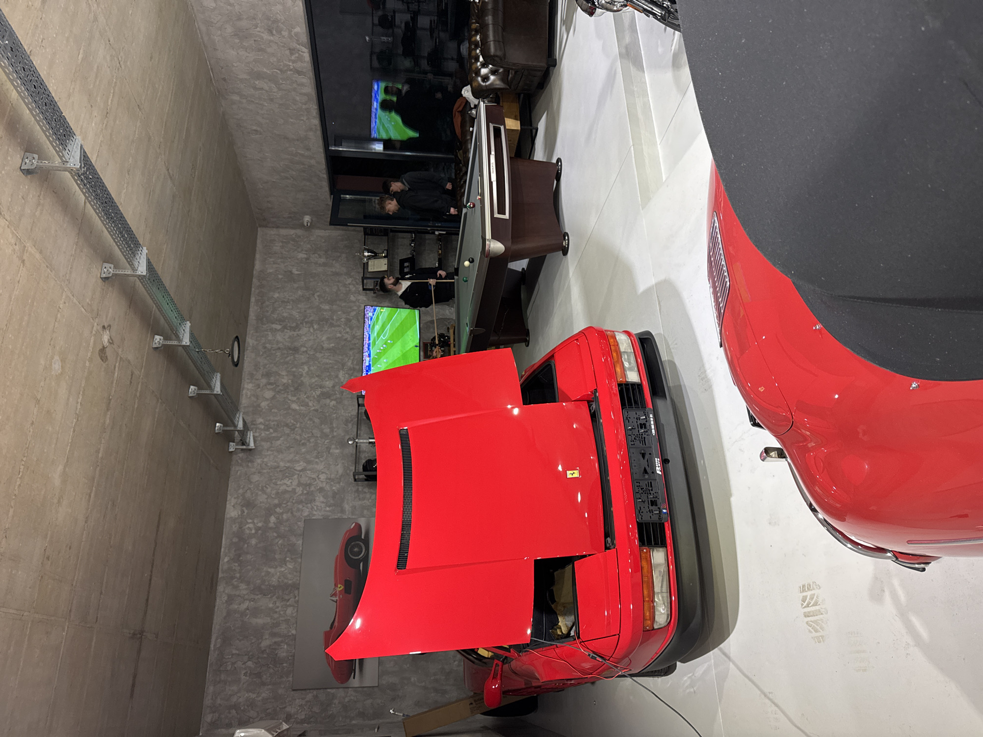The image depicts an indoor space, possibly a garage or entertainment room, located in Ivanyane, Bulgaria. The room contains a billiards table with three people playing, two televisions showing different content, a red sports car with its hood open, and another red sports car partially visible in the foreground. A photograph of a red car is mounted on the wall. Various pieces of furniture and decorative items are present. Structural elements include a textured wall and a metal cable management system running along the ceiling. The primary actions involve people playing billiards.