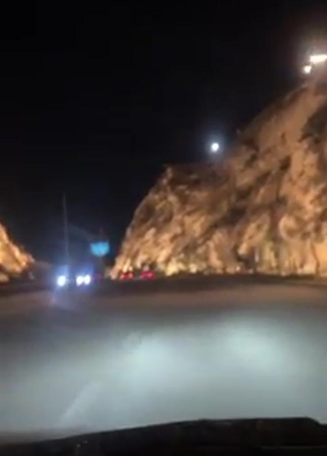car driving at night on a road bordered by rocky hills illuminated by streetlights. There are other cars on the road in the distance, as well as street signs. The moon is visible in the sky. Music is playing.