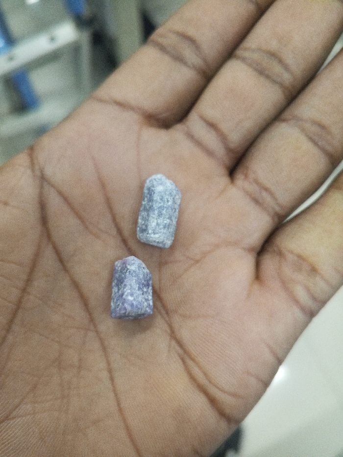 An open hand displays two small, rough, cylindrical objects. One object is a muted gray, while the other is a light purple shade. Both appear to have uneven surfaces, suggesting they are raw or unfinished materials. The hand's skin tone is a light brown with visible lines and creases. The background is slightly blurred, revealing hints of laboratory or industrial equipment.