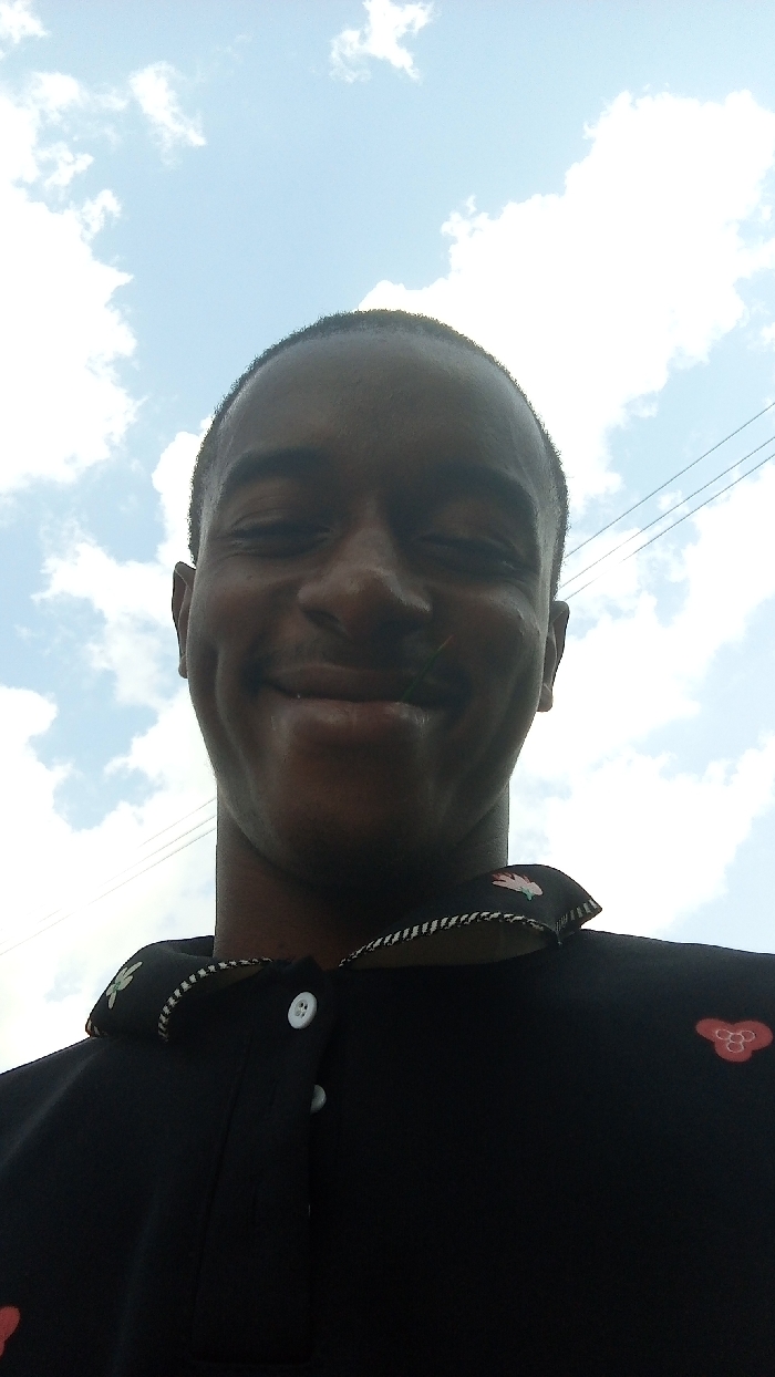 A close-up captures a smiling dark-skinned man outdoors, under a blue sky with scattered clouds