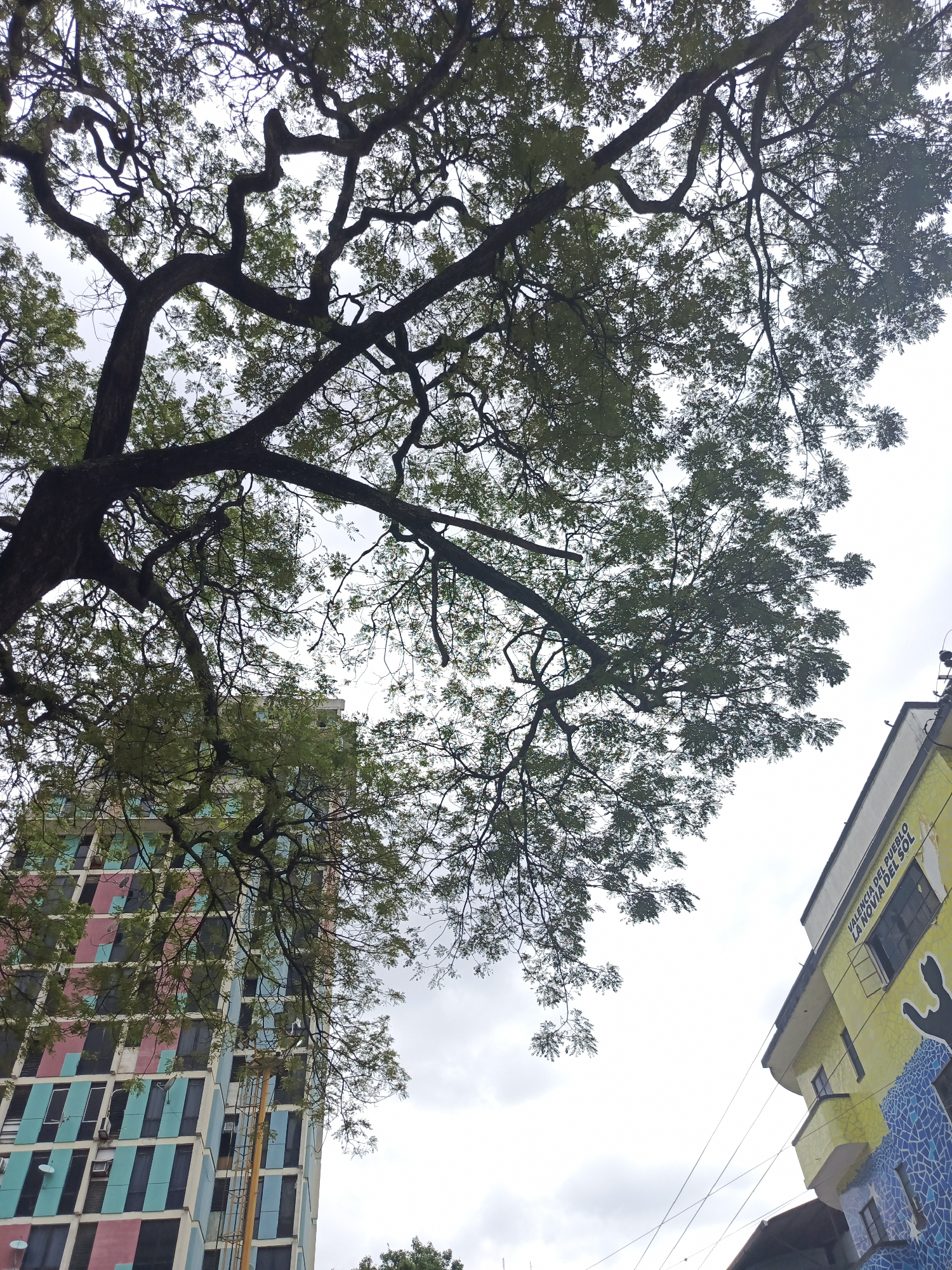 A low-angle shot reveals a cloudy sky partially obscured by the expansive canopy of a mature tree