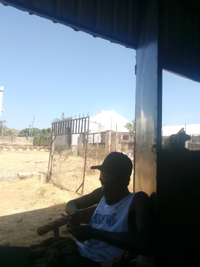 The scene is an outdoor setting in Unknown, Unknown, characterized by strong sunlight in the background and deep shadow in the foreground. A male individual, appearing young adult, is seated in the foreground, largely in silhouette under a dark corrugated metal roof structure. He wears a dark baseball cap positioned backward and a white tank top with dark graphics. The subject is actively engaging with a small electronic device, likely a smartphone, held in both hands, with his gaze directed downwards. He sits on a wooden chair, with dark fabric draped over his lap. A dark vertical structural beam is prominent on the right side of the frame. The midground features dry, light brown ground, possibly dusty or sandy, showing faint outlines. A chain-link fence, appearing worn, acts as a barrier, with a dark metal gate featuring decorative finials integrated into it on the left. Behind this fence, a concrete wall and sparse green vegetation are visible. The background reveals a clear, bright blue sky with no clouds. Several structures are present, including a prominent white building with a distinctive sloped roof to the right of the gate, and other buildings with security wire on their tops. A utility pole is visible on the far left. The environment suggests dry, sunny conditions.