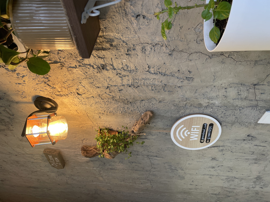 The scene depicts an interior wall within Greenstreet Cafe in Batumi, Georgia. The wall is characterized by a rough, textured, light grey finish with numerous visible cracks. A black metal lantern-style wall sconce, featuring orange-tinted glass panels and an exposed Edison-style filament bulb, is affixed to the upper left quadrant, emitting a warm, orange-yellow light onto the wall. Below the sconce, a small rectangular wooden sign, oriented horizontally, displays the text "Chill zone" and "2 этаж" (2nd floor). Further down and slightly to the left, a gnarled piece of driftwood is mounted, adorned with small green trailing foliage and secured to the wall with a visible string. Centered in the lower-middle section of the image, a circular wooden sign with a white border features a white "WIFI" symbol and text. Below this, on a black rectangular section, "greenstreet_cafe" (an Instagram handle) and "reen1234" (a password) are legible. In the upper right, a segment of a dark wooden shelf is visible, supported by a white, ornate metal bracket. A ribbed, light-colored ceramic pot holding a leafy green plant rests on this shelf. In the lower right foreground, a portion of a white, conical planter contains a small, leafy green plant rooted in dark soil. No people or interactions are present.