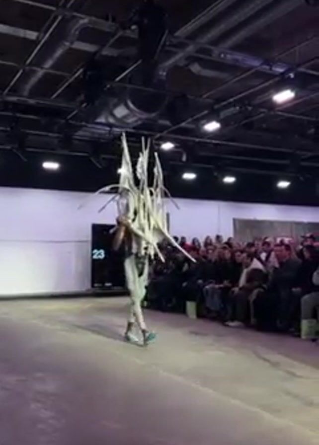 fashion show where a slender model wearing a white outfit with an intricate, angular headpiece walks down the runway