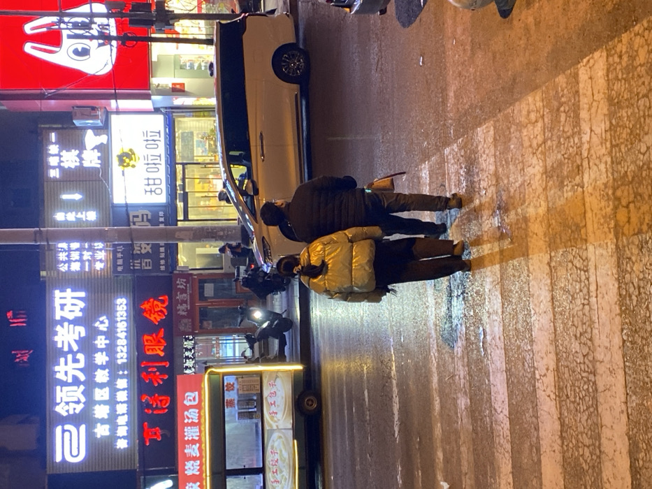 This image captures a nighttime street scene in Zhongtun, China. Two individuals are observed from behind, walking across a worn zebra crossing. The person on the left is wearing a shiny, light-colored puffer jacket and dark pants, with their hair tied back. The person on the right, slightly ahead, is wearing a dark puffer jacket and dark pants, carrying a brown bag in their left hand. The street surface appears wet or reflective under the artificial light. To the left, a green mobile food vendor cart, brightly lit internally, displays Chinese characters for "handmade dumplings" and "handmade steamed buns," along with the character for "steam." Two motorcycles or scooters are parked behind the food cart. On the right side of the street, a white minivan or MPV is present, with its driver's side visible. Further right, a partial view of another vehicle's bumper is seen. The background consists of several multi-story buildings lined with numerous illuminated signs in Chinese. Prominently displayed signs include "巨领先考研" (Ju Ling Xian Kao Yan, likely a graduate school preparation service) with a contact number, "耳诗利眼镜" (Er Shi Li Yan Jing, an eyeglasses store), and "甜啦啦" (Tian La La, likely a dessert or beverage shop with a bee-like logo). A large red sign featuring a white cartoon character is also visible on the far right. A utility pole stands centrally, extending vertically through the frame.