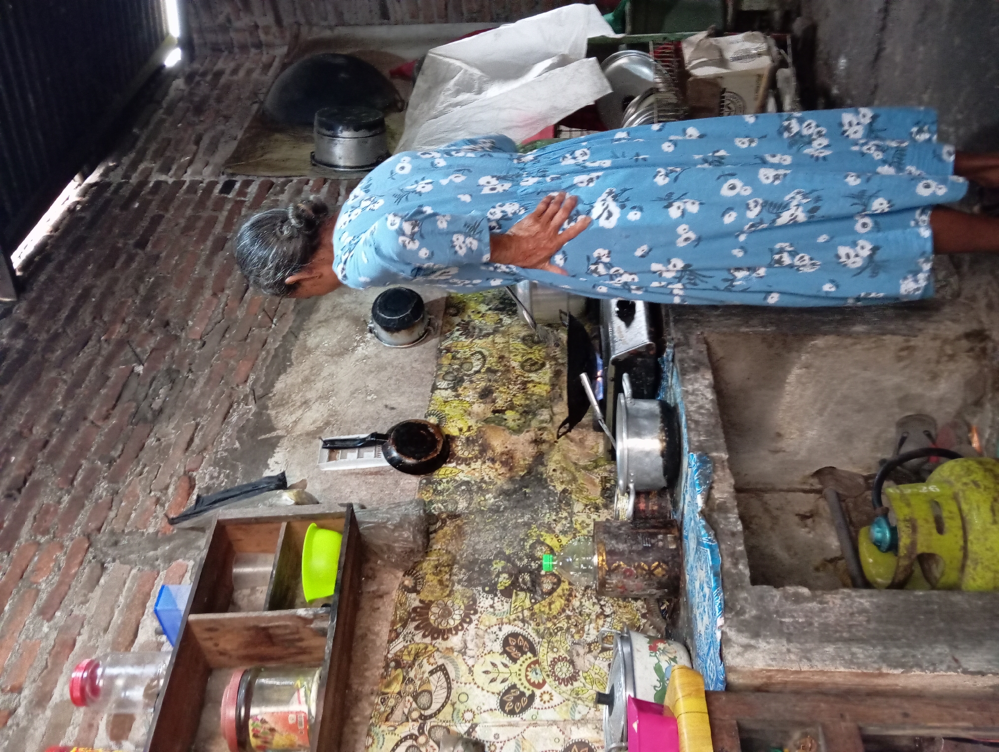 An elderly female with gray hair styled in a bun is observed from behind, standing in a rustic kitchen in Baron, Indonesia. She wears a long, light blue dress featuring white floral patterns, with her right hand placed on her lower back. The woman faces a cooking area where a black frying pan rests on a gas stove, emitting a visible blue flame. The kitchen environment includes an upper section of exposed red brick wall, transitioning to a textured wall below, partially covered by a patterned backsplash exhibiting discoloration and grease stains. A concrete countertop supports multiple metal pots, a pink plastic bowl, and a clear plastic bottle. Below the counter, a yellow-green 3kg LPG gas cylinder is connected to the stove. A wooden shelf above the counter holds jars and a bright green plastic bowl, while a black frying pan hangs from a hook on the wall. The space appears functional and well-used, characterized by its aged and utilitarian features.