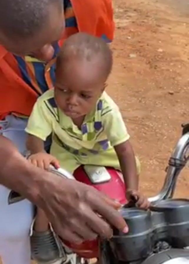 An adult man is sitting on a parked motorcycle with a young child seated on his lap, also positioned on the motorcycle's seat. The man is wearing an orange and blue patterned shirt with white pants. The child is wearing a yellow shirt with a green pattern. The man is touching the motorcycle with his right hand, pointing to the fuel tank. The child is looking at the man's hand and the motorcycle. The motorcycle is red and black, with silver handlebars. The background appears to be a dirt road or yard.